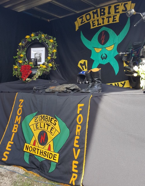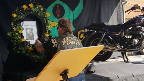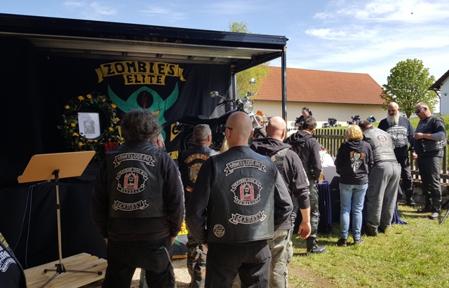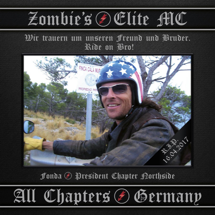 Wir bedanken uns bei allen, die bei der Verabschiedung von unserem Bruder Fonda, so zahlreich erschienen sind und ihm die letzte Ehre erwiesen haben: Familie, Brüder des Zombies Elite MC, Freunde, Allmächd MF, Angeli Negri MC, Bandidos MC, Black Legion MC, Black Souls MC, Champions MC, Compadres MC, Desperados MC, Dragons MC, Ghost Angels MC, Gladiators MC, Golden Drakes MC, Gremium MC, Heavens Own MC, Harley Gang, Hells Angels MC, Iron Horses MC, Knight Riders MC, Lucifers Messengers MC, Outsider MC, Skull Spiders MC, Sons of Silence MC, The Fans MC, Tramps MC, Wheels MC-USA.