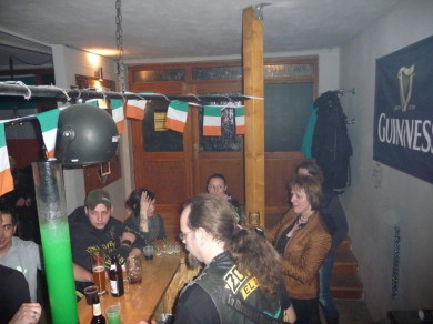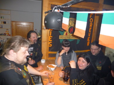 Die Wiedereröffnungsparty des Clubhauses stand unter dem Motto: Irish Night. Es kamen zahlreiche vom Winterschlaf erwachte und partyhungrige MC Members. Free Biker, Freunde und Familienangehörige sorgten für die richtige Mischung. Auf der Party ging es feucht und fröhlich zu. Neben dem Clubhausstandard gab es noch Irish Whisky und Bier. Zum Futtern boten die Veranstalter irisches Essen und fränkischen Leberkäse an. Eine gute Grundlage ,um an der Bar noch einige alkoholische Getränke zu vernichten. Irische Musik dröhnte aus den Lautsprechern. Es ging locker und freundschaftlich zu. Die Prospekt`s ,welche hinter der Bar standen, ging die Beschäftigung nie aus. So lief die Party durch die Nacht, bis der letzte Gast voll zufrieden die Heimreise antrat.